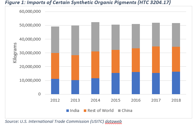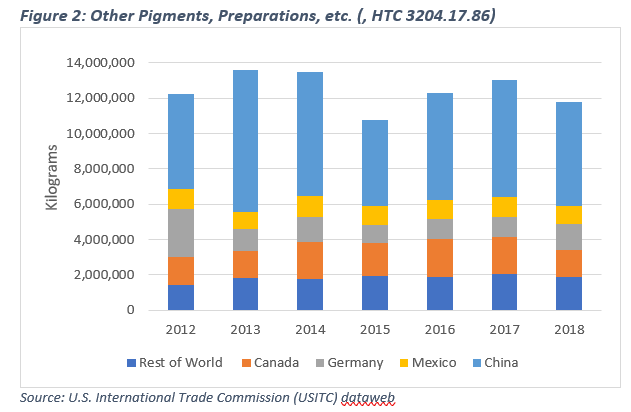 U.S. trade data highlight the extensive reliance on foreign sourced pigments, particularly those produced in China and India. The United States maintains a large trade deficit in synthetic organic pigments and dyes, virtually all of which is attributable to pigments and preparations classified under Harmonized Tariff Code 3204.17. China is the dominant exporter of this category of pigments, exporting a total value of $1.029 billion worth of products out of a global export market of $4.838 billion.1 As shown in Figure 1, the United States has consistently imported roughly 50 million kilograms annually, and the U.S. total trade deficit in this category reached nearly $250 million in 2018.